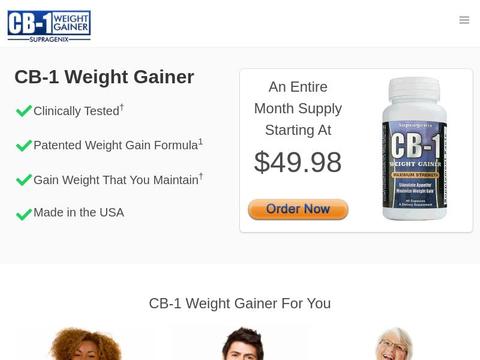 · CB-1 Weight Gainer Review. CB-1 Weight Gainer is a natural pill that promises to help women, men, and seniors gain weight in a safe and effective way.. Find out how CB-1 Weight Gainer works today in our comprehensive review.. What is CB-1 Weight Gainer? CB-1 Weight Gainer is a weight gainer supplement. While most of the diet pill industry online focuses on weight loss, there’s a smaller ...Read more ...